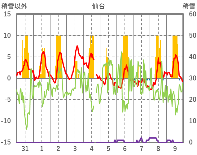 | 日 | 時 | 気温 | 降水 | 風向/風速 | 日照 | 積雪 | 降雪 |
