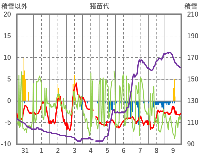 | 日 | 時 | 気温 | 降水 | 風向/風速 | 日照 | 積雪 | 降雪 |