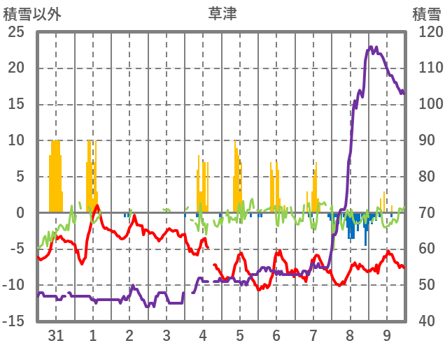 | 日 | 時 | 気温 | 降水 | 風向/風速 | 日照 | 積雪 | 降雪 |