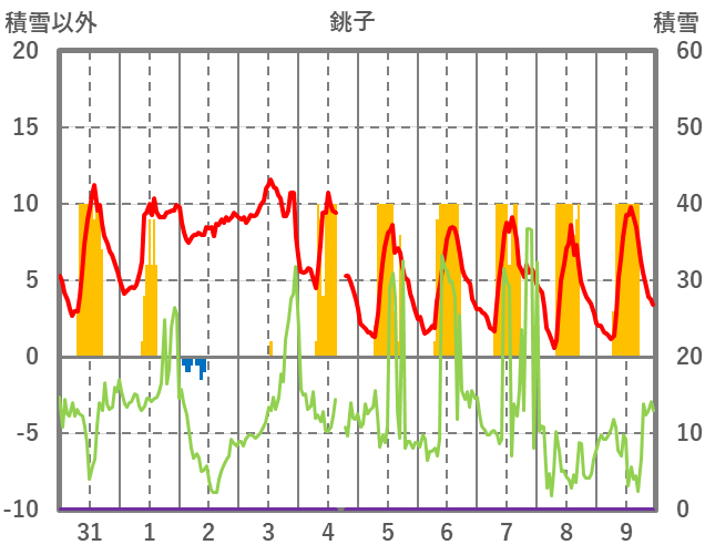 | 日 | 時 | 気温 | 降水 | 風向/風速 | 日照 | 積雪 | 降雪 |
