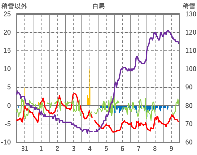 | 日 | 時 | 気温 | 降水 | 風向/風速 | 日照 | 積雪 | 降雪 |