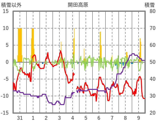 | 日 | 時 | 気温 | 降水 | 風向/風速 | 日照 | 積雪 | 降雪 |