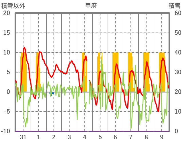 | 日 | 時 | 気温 | 降水 | 風向/風速 | 日照 | 積雪 | 降雪 |