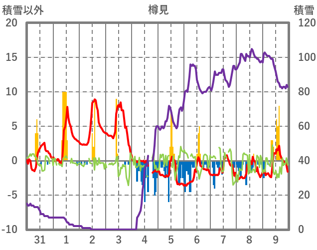 | 日 | 時 | 気温 | 降水 | 風向/風速 | 日照 | 積雪 | 降雪 |