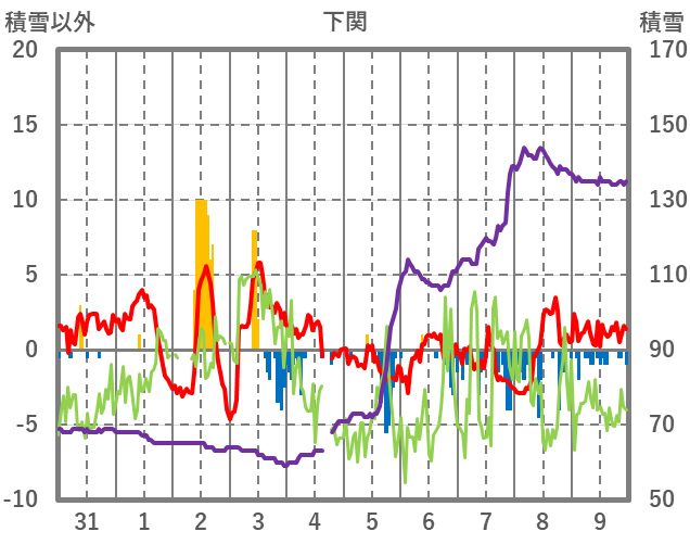 | 日 | 時 | 気温 | 降水 | 風向/風速 | 日照 | 積雪 | 降雪 |