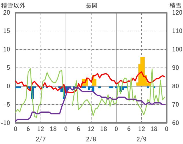| 日 | 時 | 気温 | 降水 | 風向/風速 | 日照 | 積雪 | 降雪 |