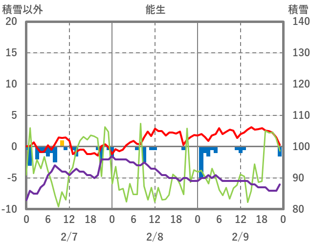 | 日 | 時 | 気温 | 降水 | 風向/風速 | 日照 | 積雪 | 降雪 |
