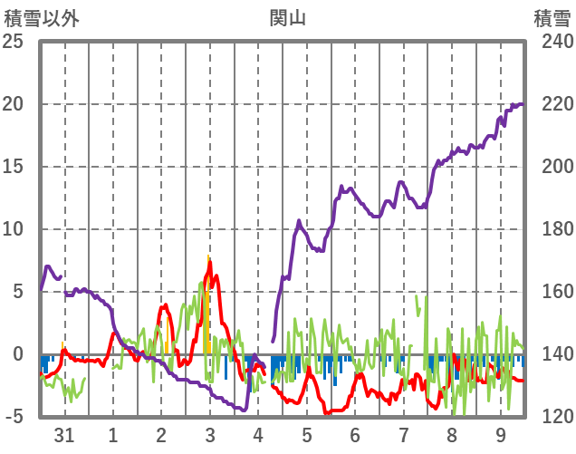 | 日 | 時 | 気温 | 降水 | 風向/風速 | 日照 | 積雪 | 降雪 |