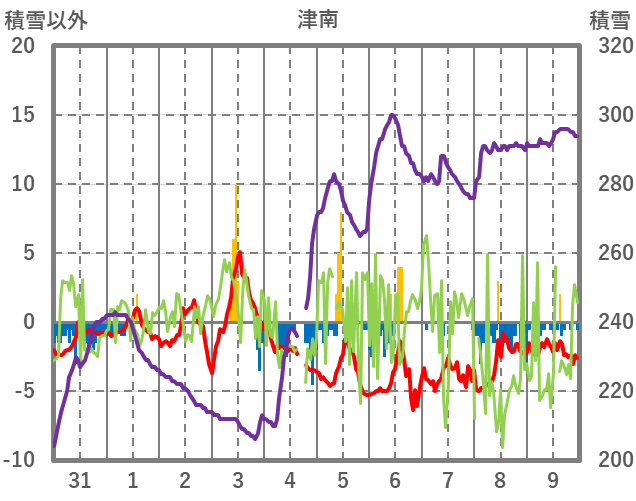 | 日 | 時 | 気温 | 降水 | 風向/風速 | 日照 | 積雪 | 降雪 |