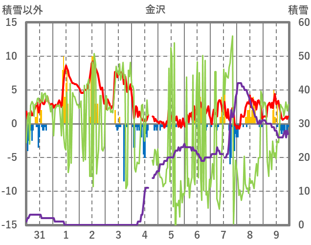 | 日 | 時 | 気温 | 降水 | 風向/風速 | 日照 | 積雪 | 降雪 |