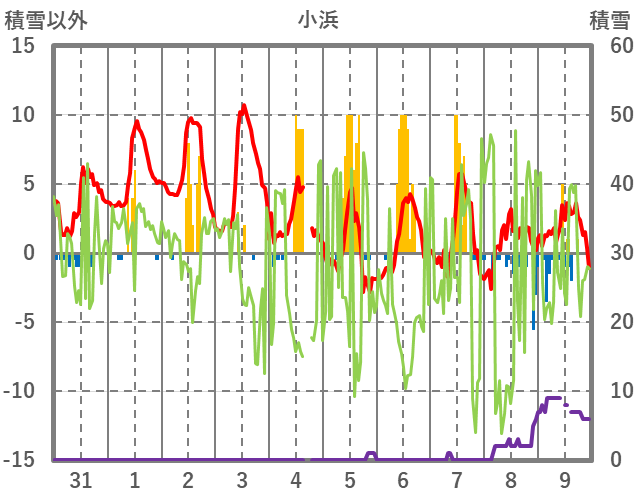 | 日 | 時 | 気温 | 降水 | 風向/風速 | 日照 | 積雪 | 降雪 |