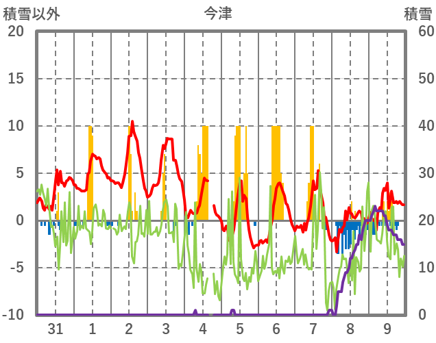 | 日 | 時 | 気温 | 降水 | 風向/風速 | 日照 | 積雪 | 降雪 |