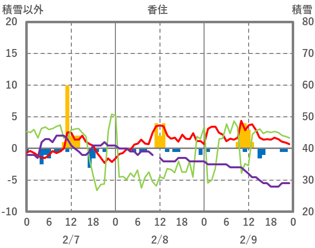 | 日 | 時 | 気温 | 降水 | 風向/風速 | 日照 | 積雪 | 降雪 |