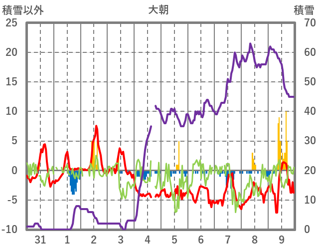 | 日 | 時 | 気温 | 降水 | 風向/風速 | 日照 | 積雪 | 降雪 |