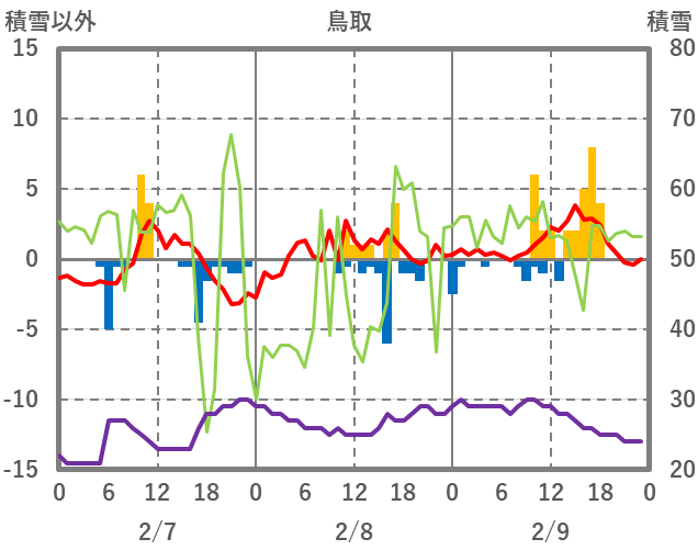 | 日 | 時 | 気温 | 降水 | 風向/風速 | 日照 | 積雪 | 降雪 |