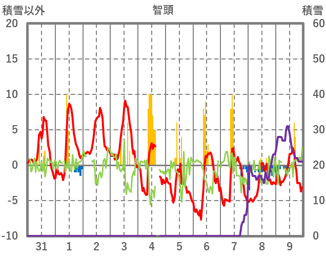| 日 | 時 | 気温 | 降水 | 風向/風速 | 日照 | 積雪 | 降雪 |