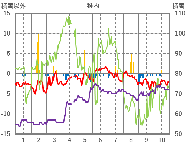| 日 | 時 | 気温 | 降水 | 風向/風速 | 日照 | 積雪 | 降雪 |