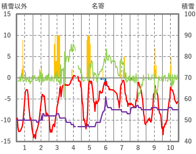 | 日 | 時 | 気温 | 降水 | 風向/風速 | 日照 | 積雪 | 降雪 |