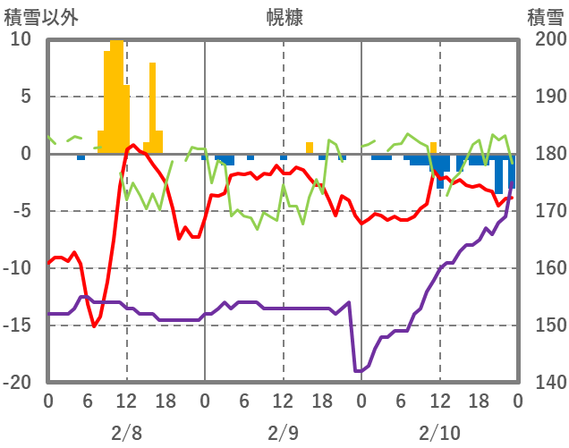 | 日 | 時 | 気温 | 降水 | 風向/風速 | 日照 | 積雪 | 降雪 |