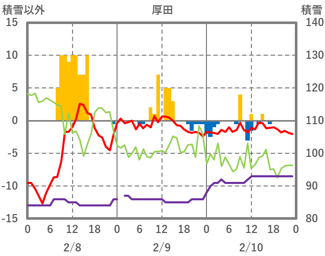 | 日 | 時 | 気温 | 降水 | 風向/風速 | 日照 | 積雪 | 降雪 |
