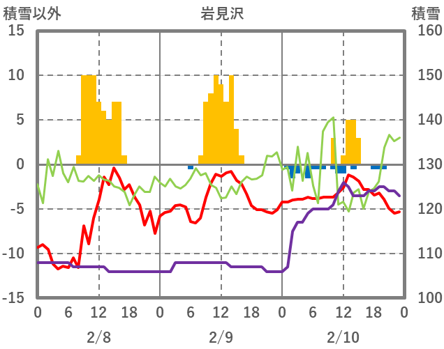 | 日 | 時 | 気温 | 降水 | 風向/風速 | 日照 | 積雪 | 降雪 |