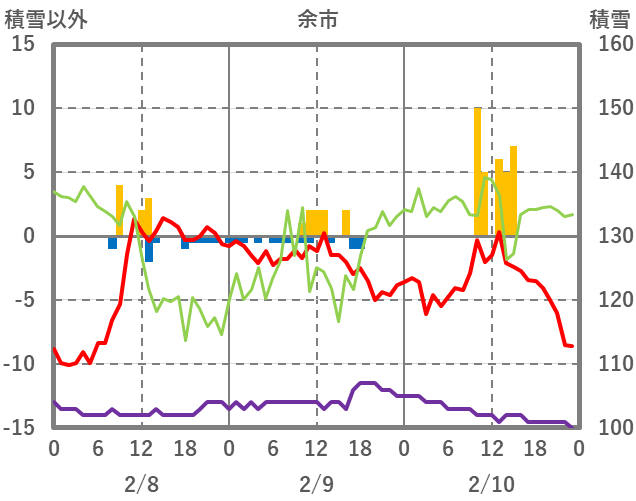 | 日 | 時 | 気温 | 降水 | 風向/風速 | 日照 | 積雪 | 降雪 |
