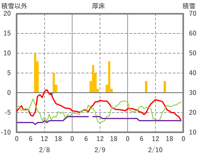| 日 | 時 | 気温 | 降水 | 風向/風速 | 日照 | 積雪 | 降雪 |