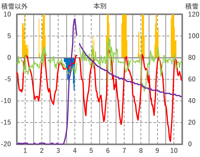 | 日 | 時 | 気温 | 降水 | 風向/風速 | 日照 | 積雪 | 降雪 |