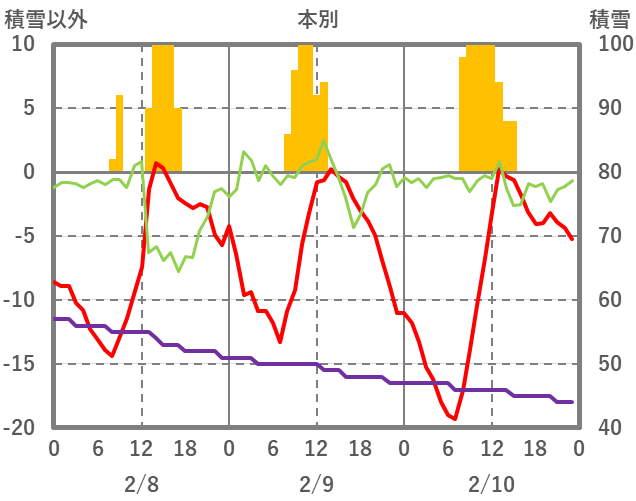 | 日 | 時 | 気温 | 降水 | 風向/風速 | 日照 | 積雪 | 降雪 |