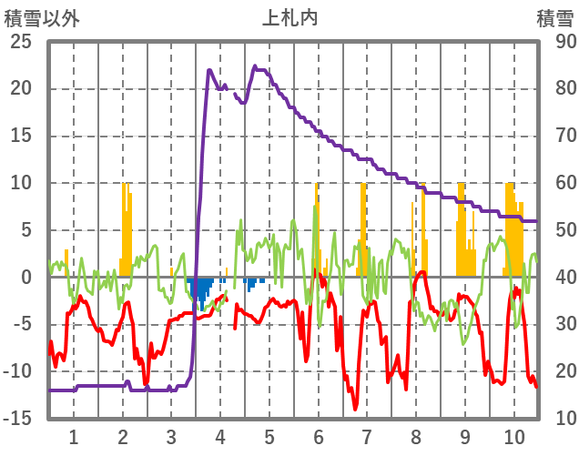 | 日 | 時 | 気温 | 降水 | 風向/風速 | 日照 | 積雪 | 降雪 |