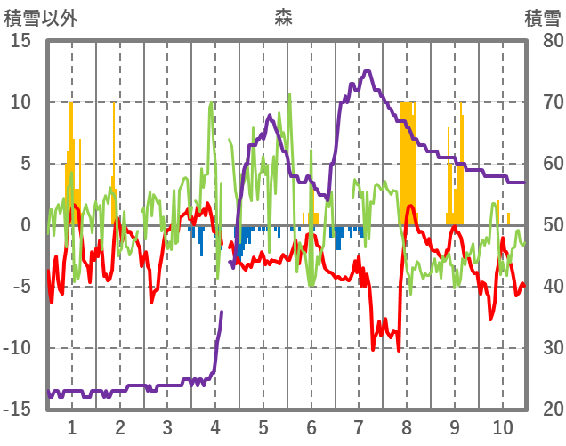 | 日 | 時 | 気温 | 降水 | 風向/風速 | 日照 | 積雪 | 降雪 |