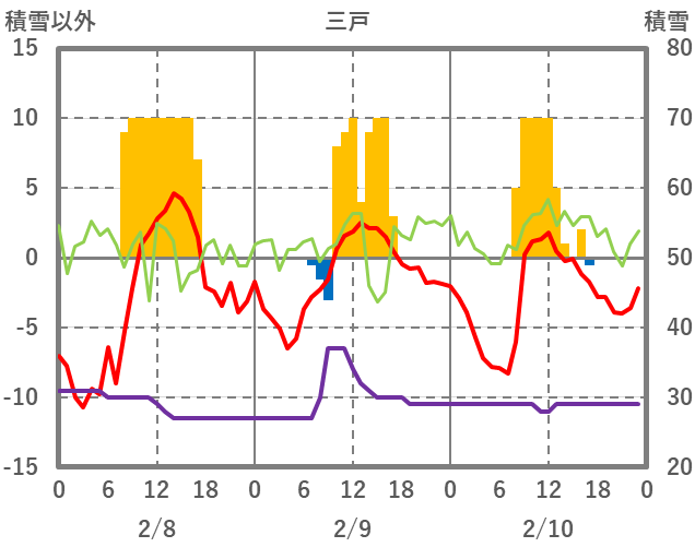 | 日 | 時 | 気温 | 降水 | 風向/風速 | 日照 | 積雪 | 降雪 |