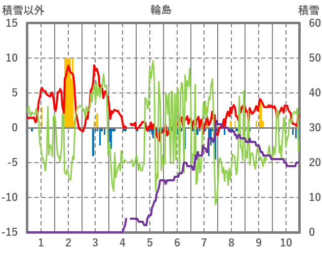 | 日 | 時 | 気温 | 降水 | 風向/風速 | 日照 | 積雪 | 降雪 |