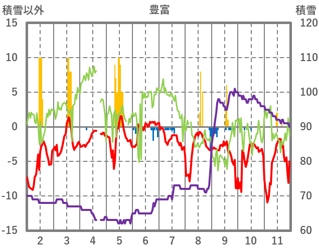 | 日 | 時 | 気温 | 降水 | 風向/風速 | 日照 | 積雪 | 降雪 |