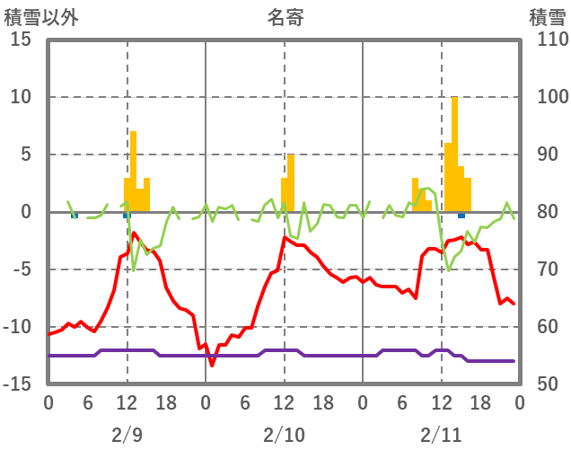 | 日 | 時 | 気温 | 降水 | 風向/風速 | 日照 | 積雪 | 降雪 |