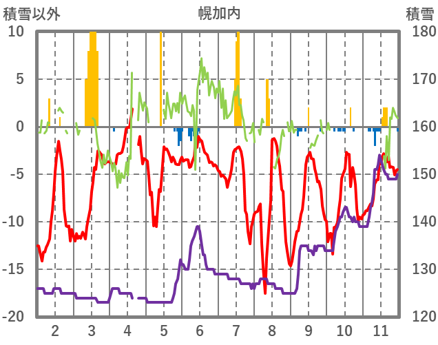| 日 | 時 | 気温 | 降水 | 風向/風速 | 日照 | 積雪 | 降雪 |