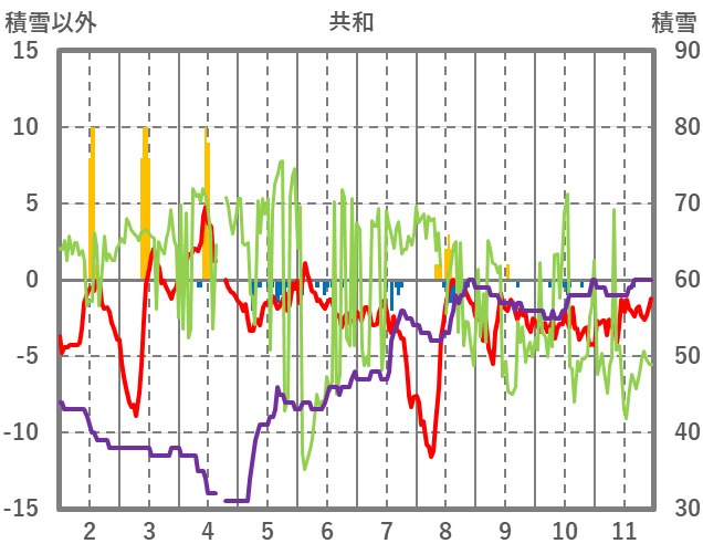 | 日 | 時 | 気温 | 降水 | 風向/風速 | 日照 | 積雪 | 降雪 |