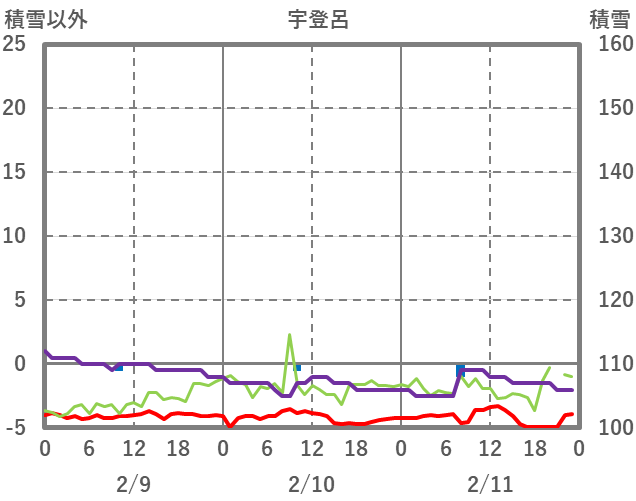 | 日 | 時 | 気温 | 降水 | 風向/風速 | 日照 | 積雪 | 降雪 |