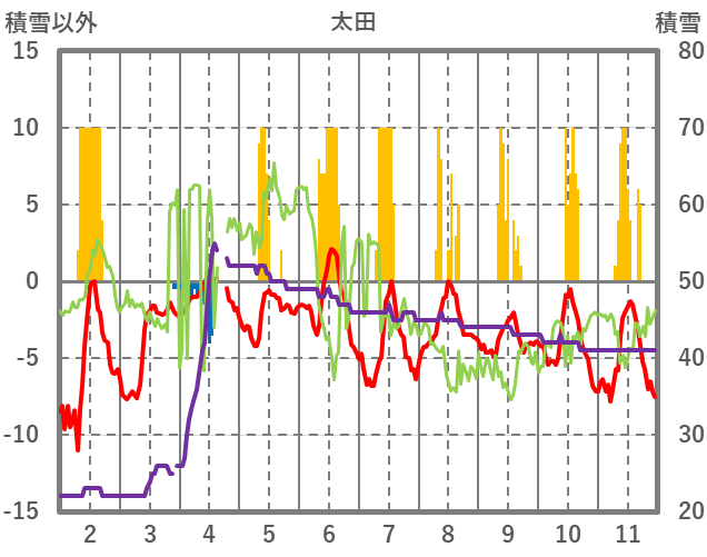 | 日 | 時 | 気温 | 降水 | 風向/風速 | 日照 | 積雪 | 降雪 |