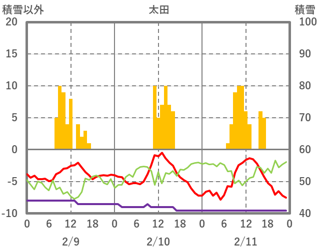 | 日 | 時 | 気温 | 降水 | 風向/風速 | 日照 | 積雪 | 降雪 |