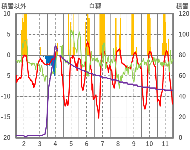 | 日 | 時 | 気温 | 降水 | 風向/風速 | 日照 | 積雪 | 降雪 |