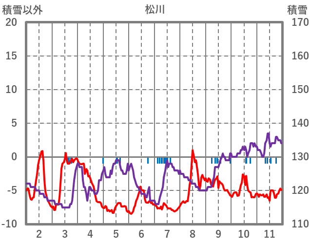 | 日 | 時 | 気温 | 降水 | 風向/風速 | 日照 | 積雪 | 降雪 |