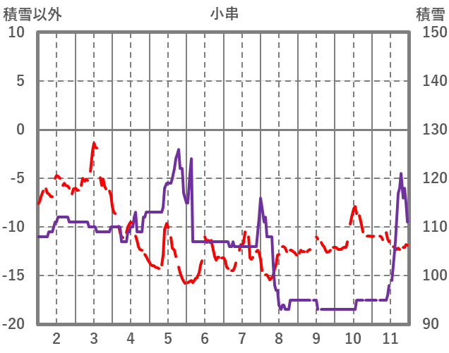 | 日 | 時 | 気温 | 降水 | 風向/風速 | 日照 | 積雪 | 降雪 |