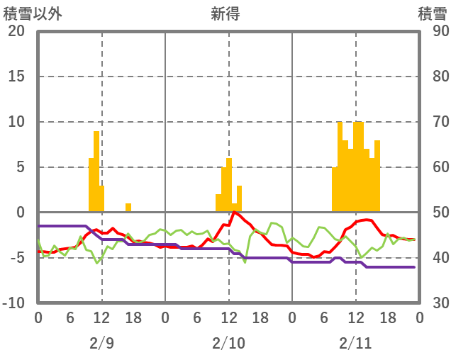 | 日 | 時 | 気温 | 降水 | 風向/風速 | 日照 | 積雪 | 降雪 |