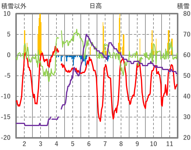 | 日 | 時 | 気温 | 降水 | 風向/風速 | 日照 | 積雪 | 降雪 |