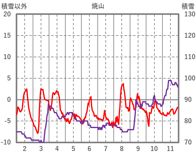 | 日 | 時 | 気温 | 降水 | 風向/風速 | 日照 | 積雪 | 降雪 |