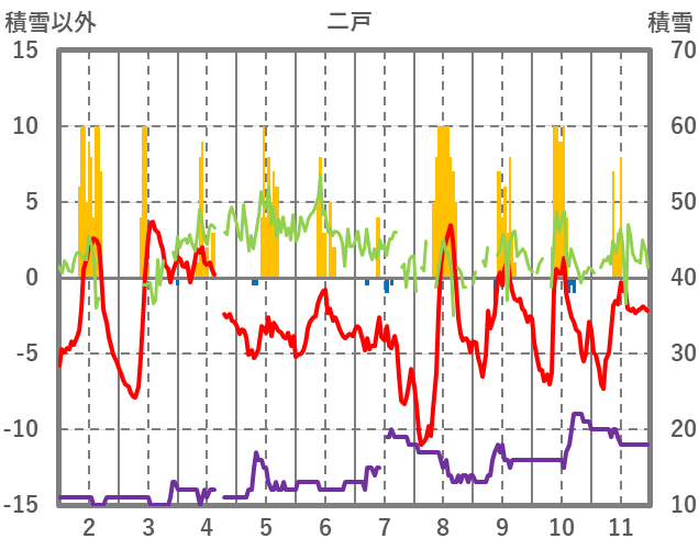 | 日 | 時 | 気温 | 降水 | 風向/風速 | 日照 | 積雪 | 降雪 |