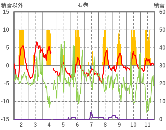| 日 | 時 | 気温 | 降水 | 風向/風速 | 日照 | 積雪 | 降雪 |