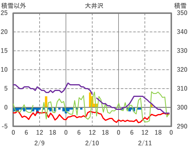 | 日 | 時 | 気温 | 降水 | 風向/風速 | 日照 | 積雪 | 降雪 |