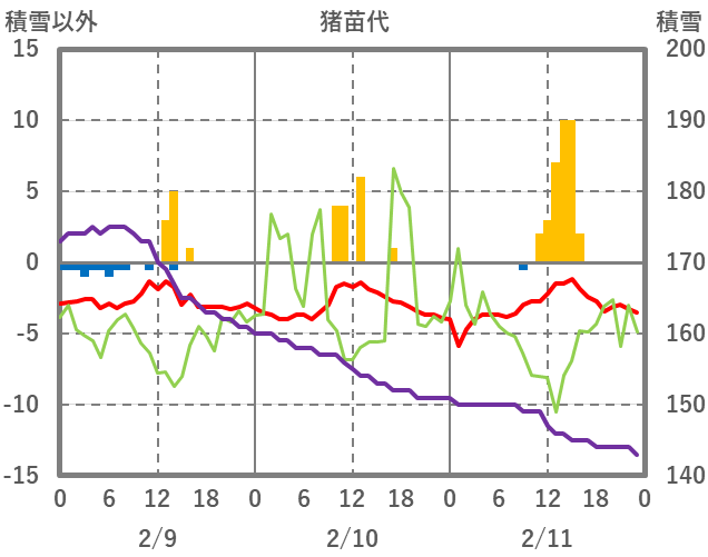 | 日 | 時 | 気温 | 降水 | 風向/風速 | 日照 | 積雪 | 降雪 |